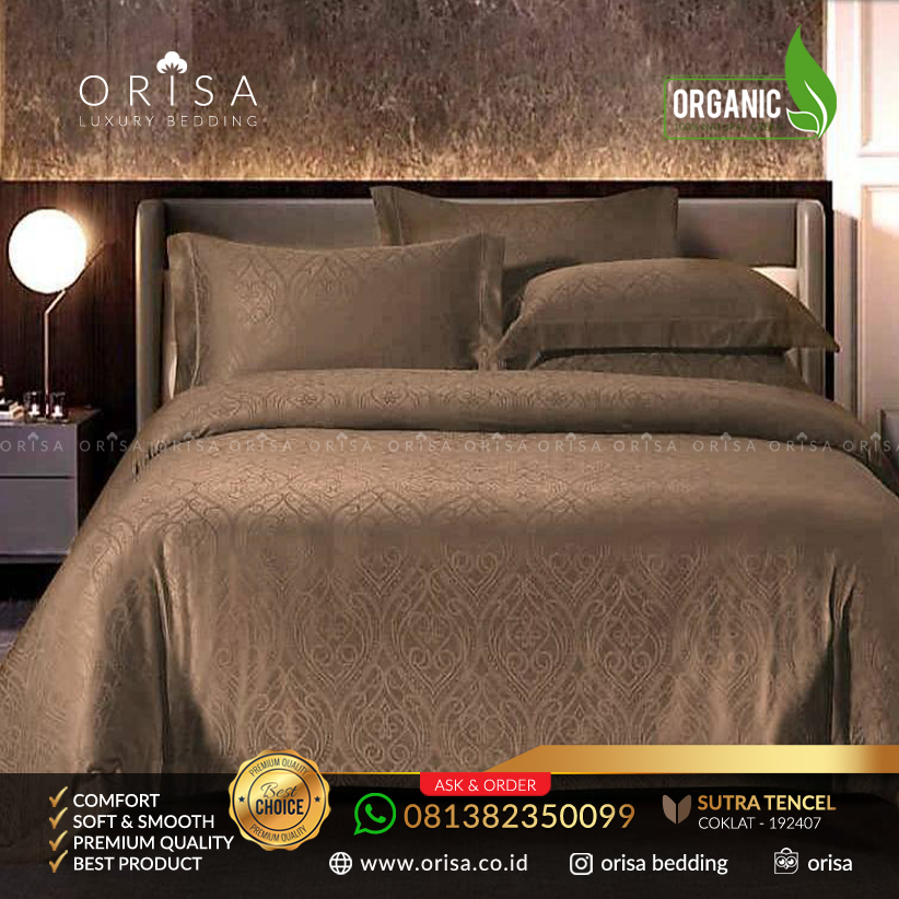 sprei mewah orisa coklat, terbuat dari bahan organik serat bamboo selulosa pilihan atau biasa di kenal dengan bahan tencel. Sudah terkenal akan kelembutannya, sangat halus, adem, dingin dan sangat nyaman dipakai. bahan pilihan kualitas tinggi membuat bahan ini kuat, tahan lama, elegan dan sangat nyaman digunakan. Rahasia sprei nya para artis selebritis, para pengusaha, bangsawan dll. Rasakan kelembutan, kemewahan, keindahan di rumah Anda.